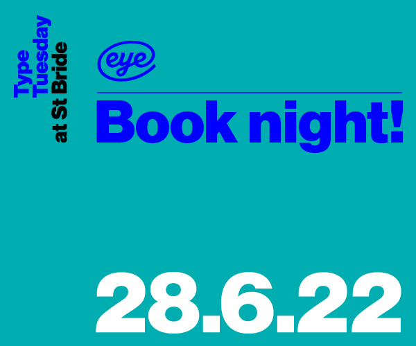 Eye’s first ‘Book night!’ – the next Type Tuesday on 28 June 2022 – brings together designers, art directors, authors, artists and readers with gripping presentations by Giles Dunn, Sonya Dyakova, Hugh Miller and Jim Sutherland, and a panel in which the speakers (plus special surprise guests) talk about their favourite books. There will be a bar and a chance to buy the latest issue – Eye 103 – along with some bargain back issues.