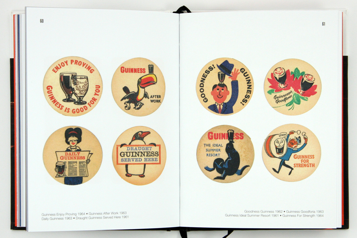 Spread showcasing a selection of illustrative coasters from Guinness, 1961-1964.