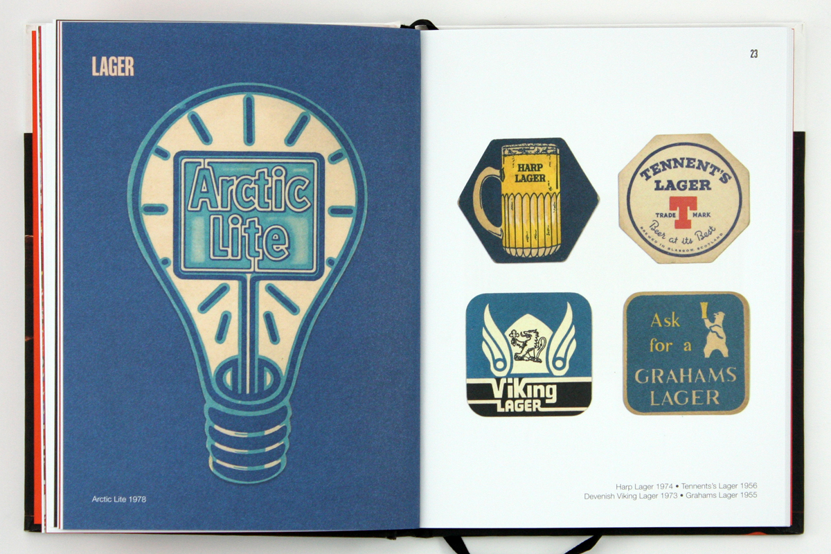 The book is divided into beverage-led and topical chapter. Displayed here are examples of beer mats of lagers, 1955-1978.