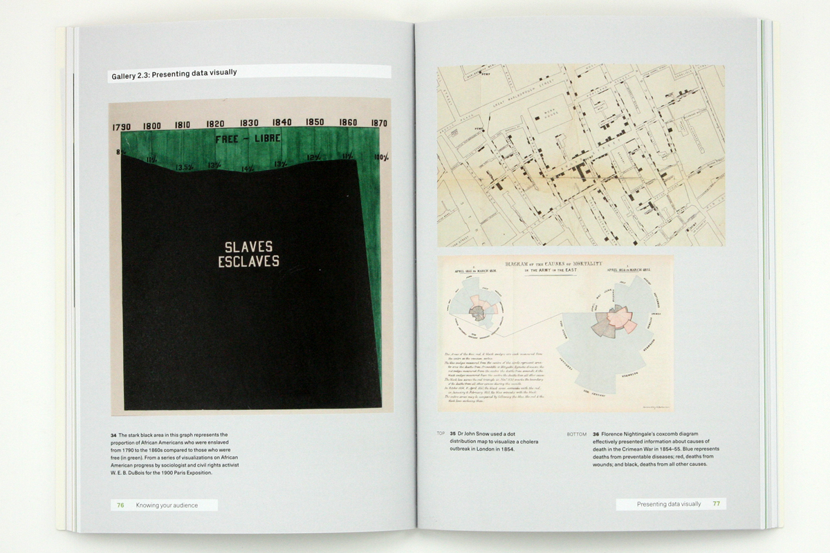 Spread featuring information design by W.E.B. DuBois (left), Dr John Snow (top right) and Florence Nightingale (bottom right). See also ‘Lady with the diagram’ in Eye 82.