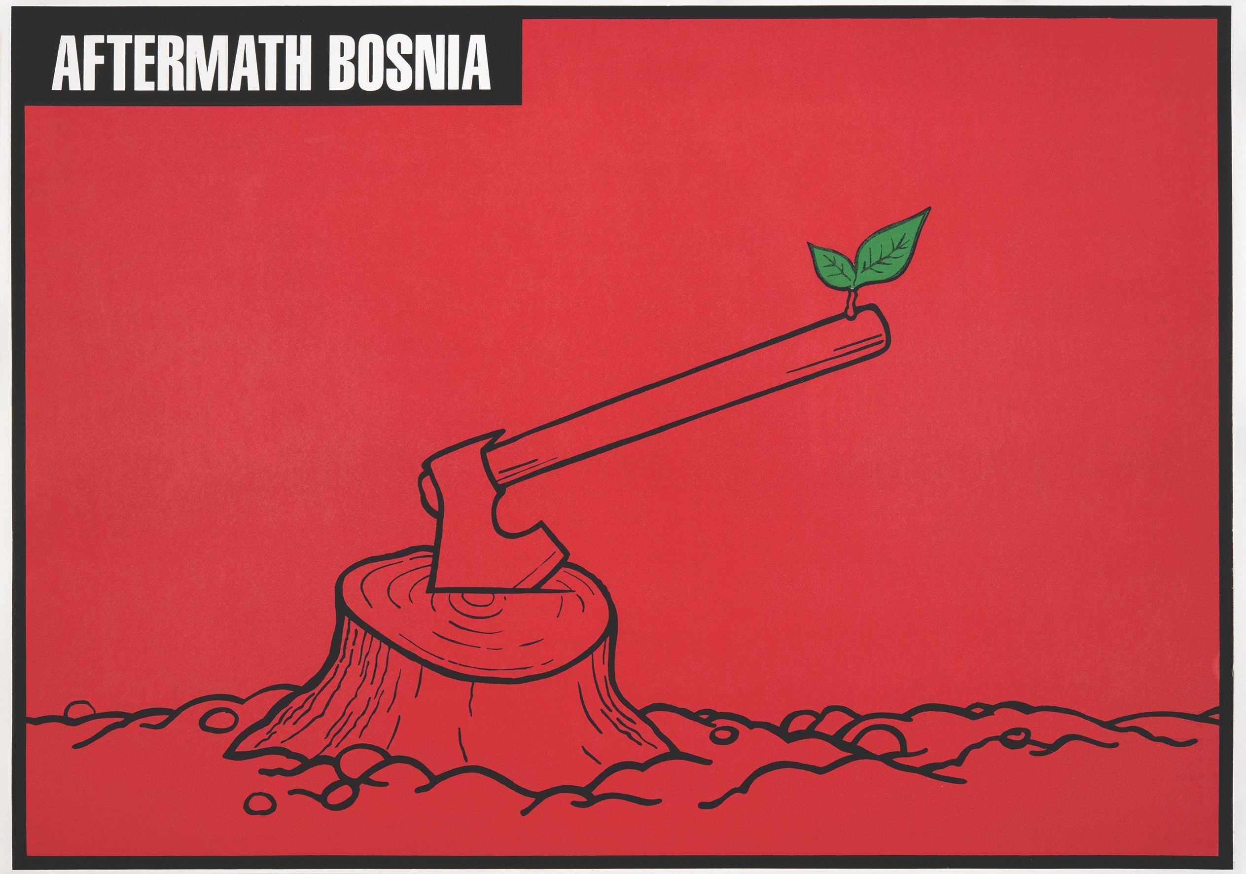 silkscreen posters, many of which are in Bosnian War Posters. Ðelilović was asked to adapt the Shigeo Fukuda-inspired Aftermath Bosnia (1997) for the book’s cover (an idea that came from Carolina Rivas, Sarhandi’s co-author on ‘This is 1968 … this is Mexico’ in Eye 56). Ðelilović reshaped the tree trunk to resemble Bosnia’s external borders.