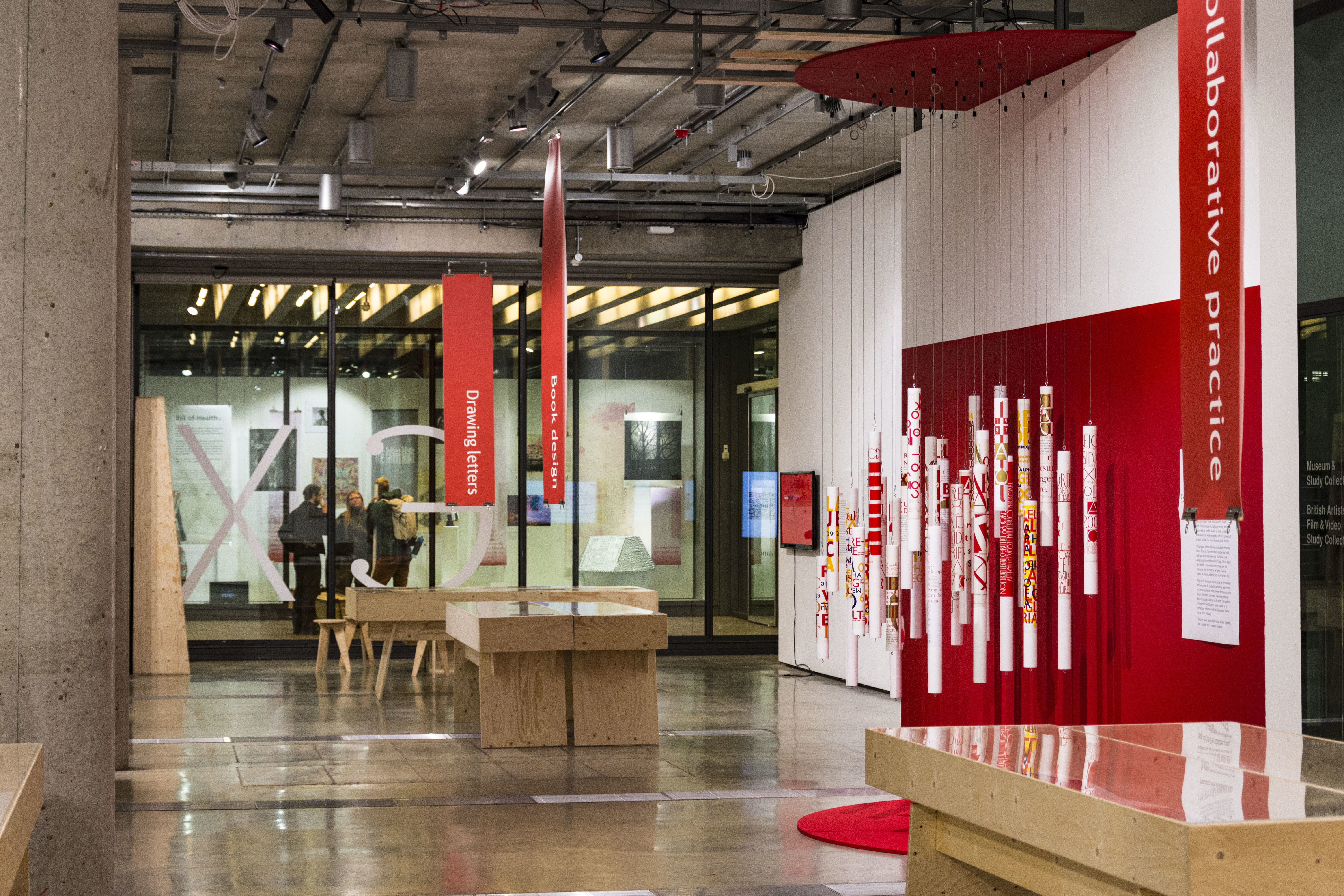 This exhibition shows an inspiring designer, teacher, historian, thinker of great flexibility. The work is laid out on the walls of the spacious Lethaby Gallery, and in a series of pine vitrines. Red banners divide it up into parts: ‘Book design’, ‘Collaborative practice’, ‘Drawing letters’, and so on.