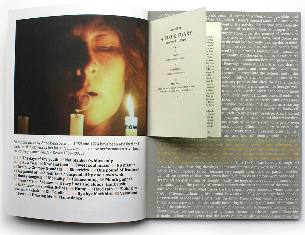Spread from Anne Bean’s Autobituary, Matt’s Gallery, 2006. Baines’s use of perforated inner pages allowed the book to be machine-bound.