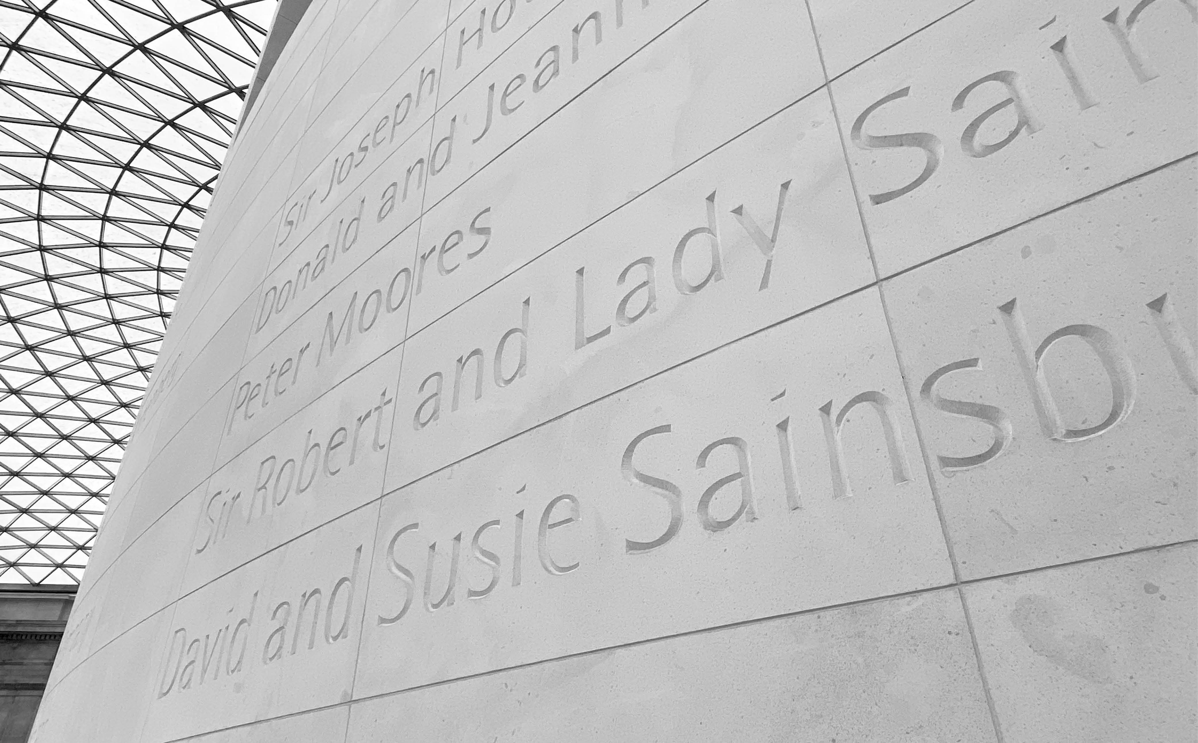 Typographers know that a typeface that works well as a text face is unlikely to be right for headlines or signs. Working in three dimensions, in stone, at large scale, this principle is magnified. When Martin Cook won the commission to cut the inscriptions in the Great Court of the British Museum, the architects wanted him to use the typeface Rotis. Although Rotis was originally designed for signs, using it at large scale and introducing a third dimension by cutting the face into the stone meant that Cook needed to change subtly the shape and proportions of each letter to make it work with a ‘v’-cut on a curved surface.