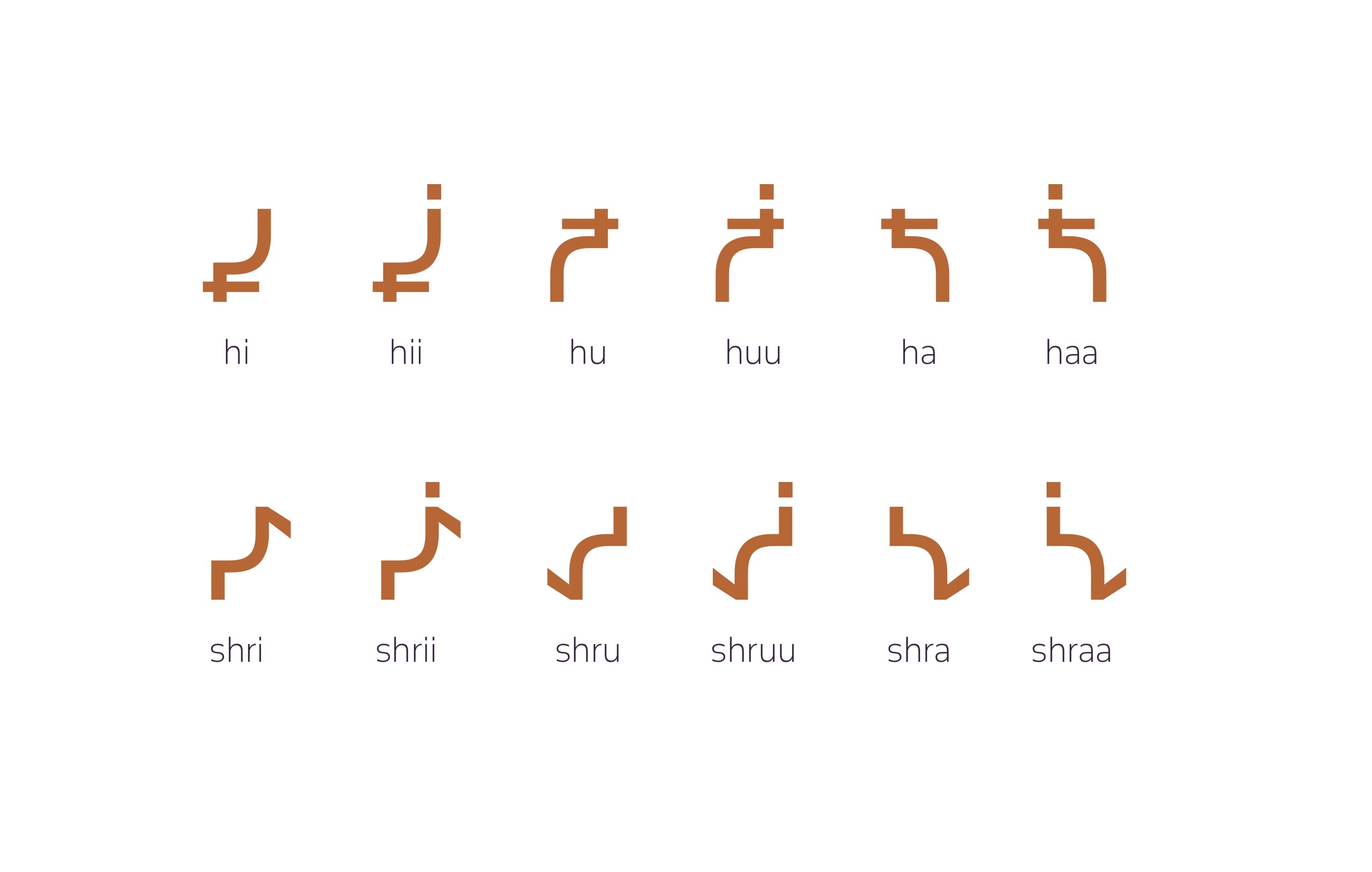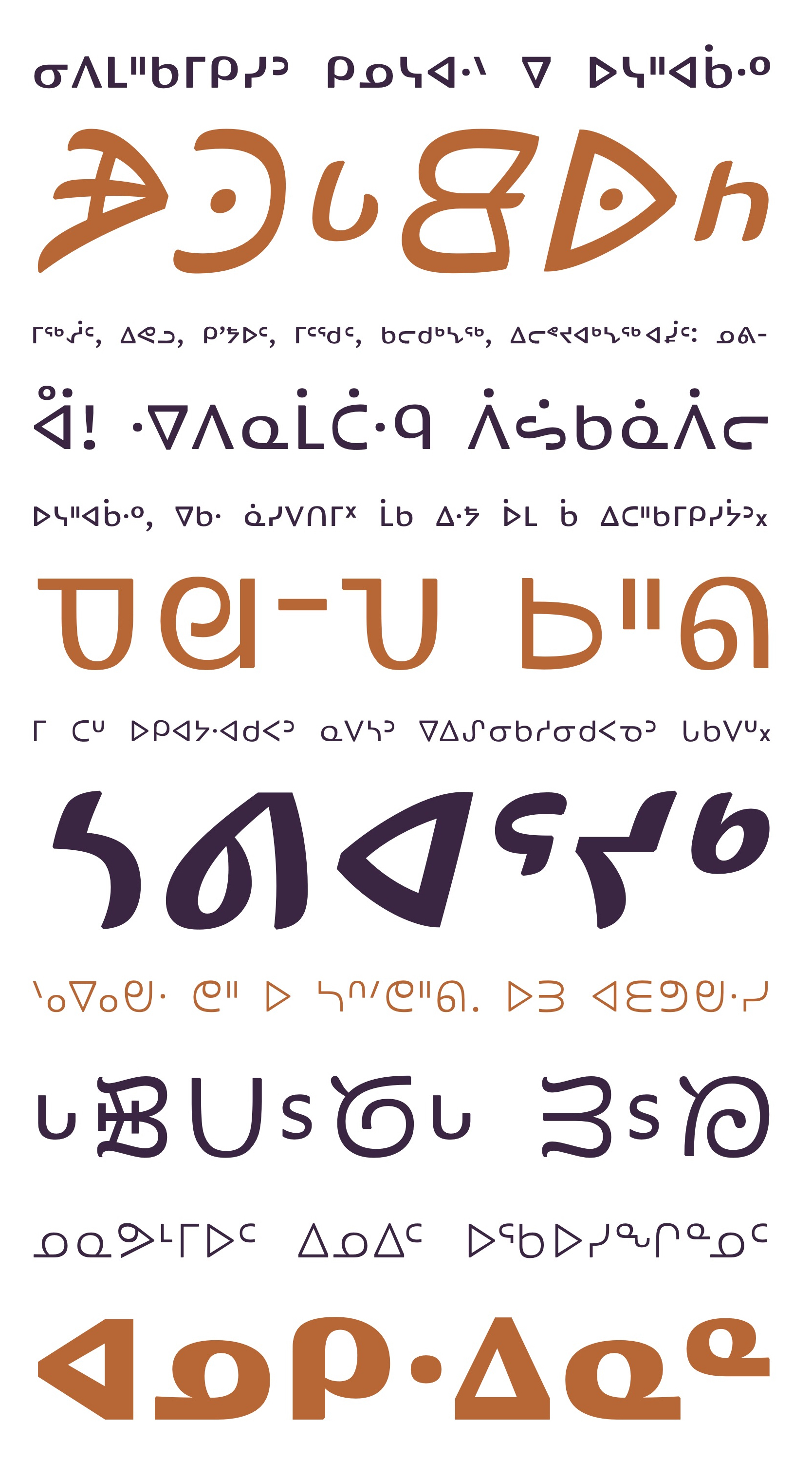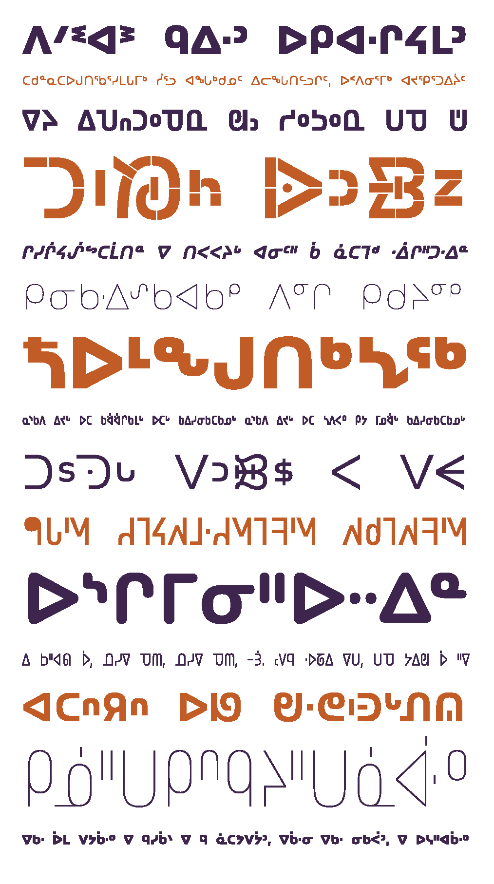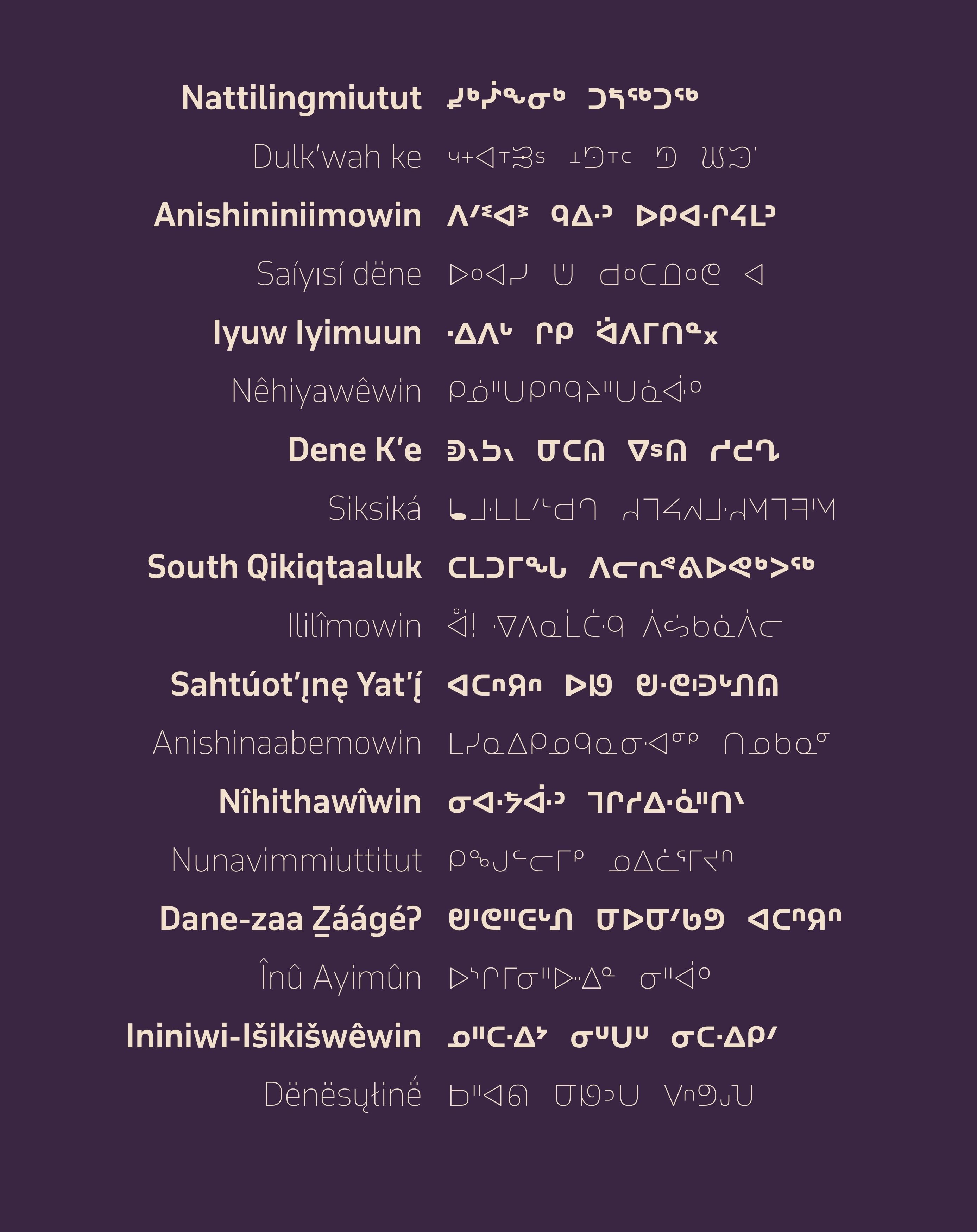 November Syllabics across various different Canadian Indigenous languages. This is a low-contrast typeface family containing extensive weight and width members. Informed by community research and user testing, November expands the typographic palette of the Syllabics while offering comprehensive coverage of the local typographic preferences for all Indigenous communities in North America that use the script.
