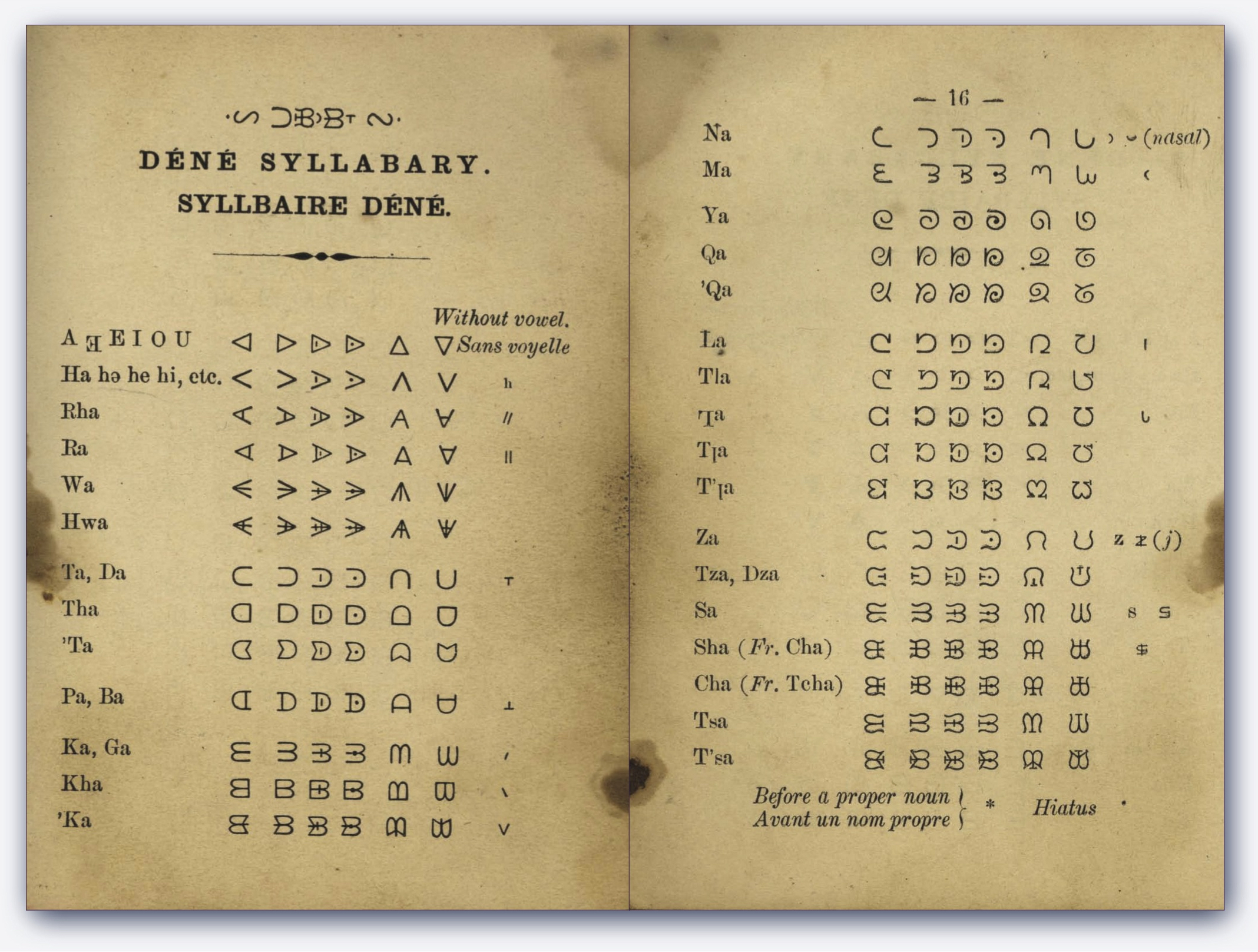 The Dakelh (Carrier) Syllabics, from Adrien-Gabriel Morice’s Carrier prayer book, 1901. The first printed syllabics appeared in 1841 for the Cree First Nations and were adapted for use by many other Indigenous communities, including Inuktut, Anishinaabemowin, and Dene language communities.