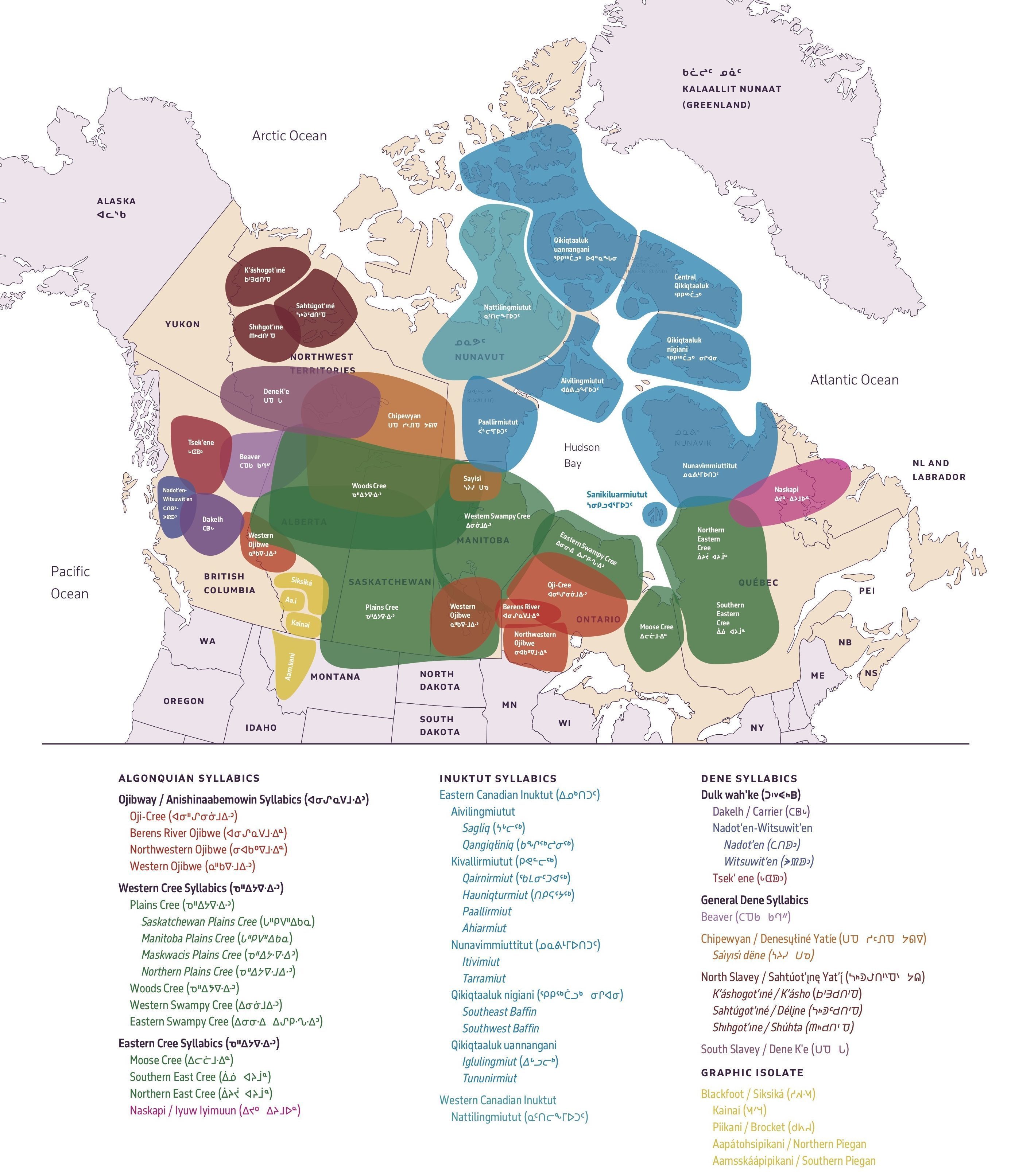 Map by Kevin King of the geographic distribution of the Indigenous languages that use the UCAS across North America, broken into dialects and regions. Some of these primary languages – such as Nêhiyawewin, Anishishinaabemowin, Siksiká and Inuktut – have linguistic communities outside Canada – in the United States, Siberia, and Greenland.