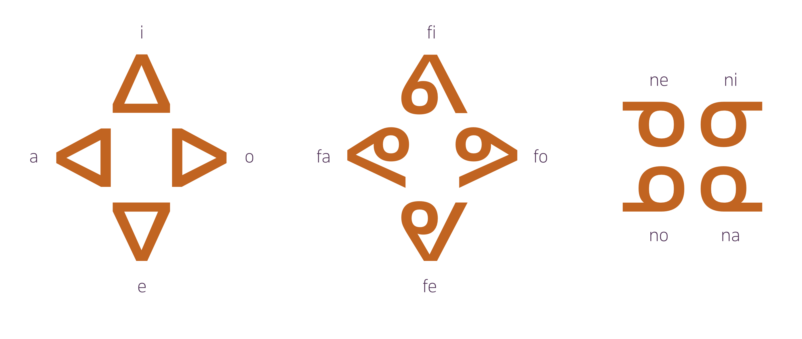 One of the key characteristics of the syllabics system is that by rotating the same character through 90 degrees a different vowel sound is represented for each syllable.
