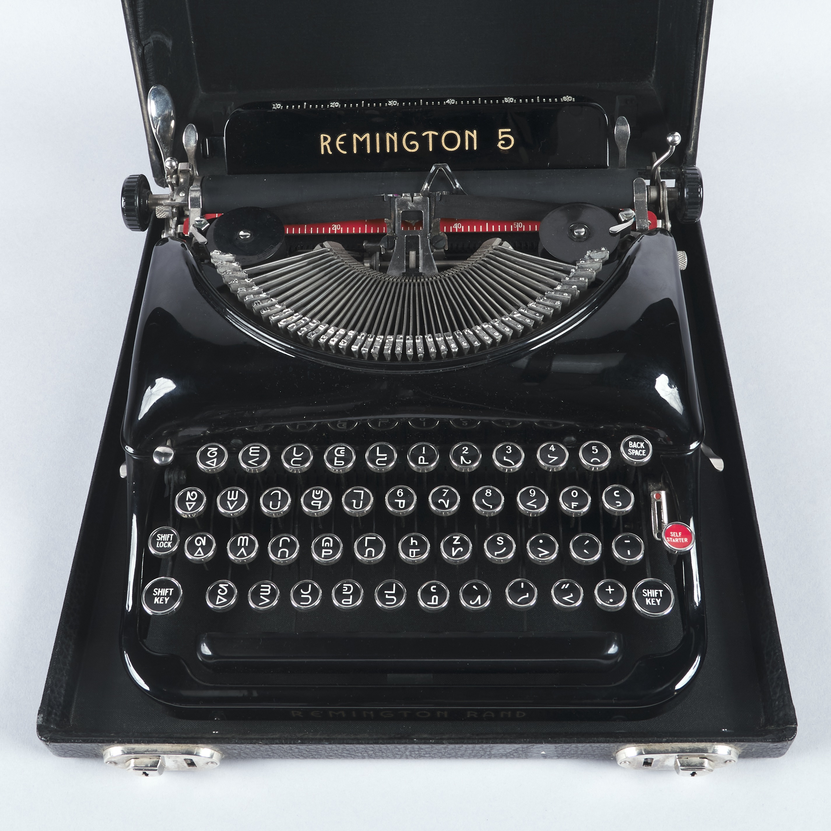 Syllabics typewriter. A Remington typewriter outfitted for preparing texts in both Cree and Dene Syllabics, manufactured in the 1940s. Syllabics typewriters replaced lead type printing methods in the early twentieth century, and increased accessibility to more Indigenous communities towards preparing more formal texts for reproduction. Photo courtesy of Sam Waller Museum, 2021.