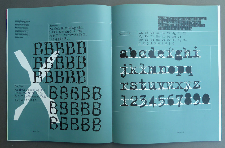 ‘The digital wave’ by Robin Kinross in Eye 7, vol. 2, 1992, featured LettError’s Beowolf and Beo Sans (left) and Trixie (right).