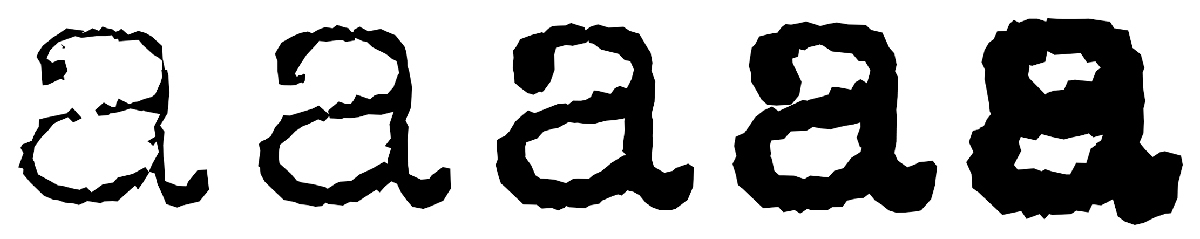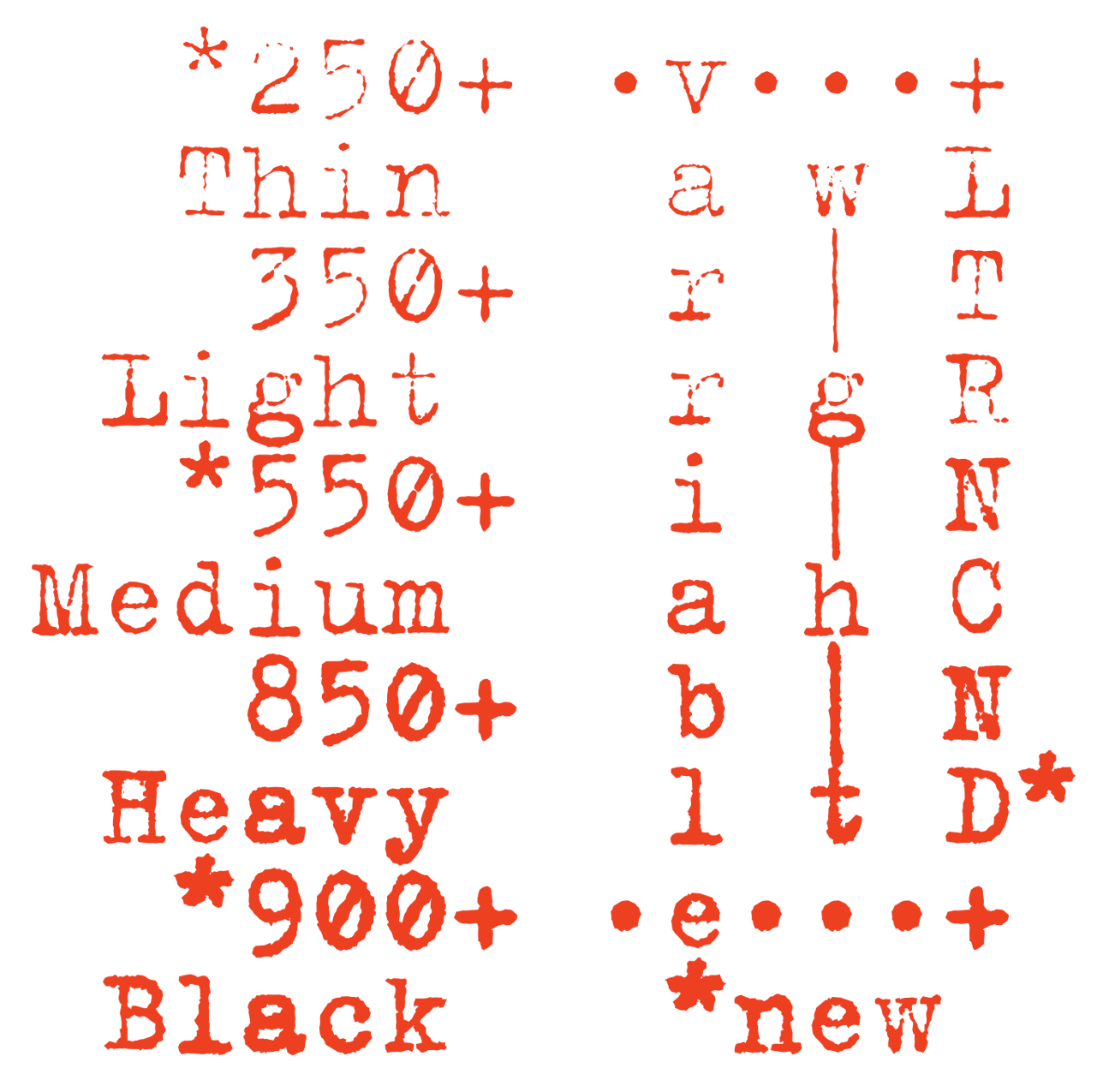 Like a classic album, Trixie has been added to, remixed, remade and remastered. First came more weights, then a cameo version, then a version with more texture and randomisation. Now Trixie is back again but with a new name: Neither Confirm Nor Deny (NCND), which sounds like something out of an X-files fan conference. Released by Van Blokland’s own LettError foundry, it has become a 21st-century variable font that smoothly transitions from light to bold with Greek, Cyrillic and Latin, though ‘smoothly’ seems the wrong term for this roughest of rough faces. To achieve this, Van Blokland has had to develop a new method of interpolation for which the two masters no longer match. And though 30 years have passed, and typewriters have become antiquated and forgotten tools, its qualities remain undimmed.