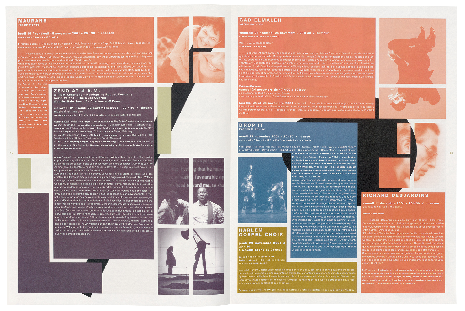 Théâtre d’Angoulême, 2001-2002. Lenz’ long-time, long-distance collaboration with Vincent Perrottet began with the 2001-02 brochure and posters for the Angoulême city theatre. Their design – partly inspired by the theatre’s famous classical façade.