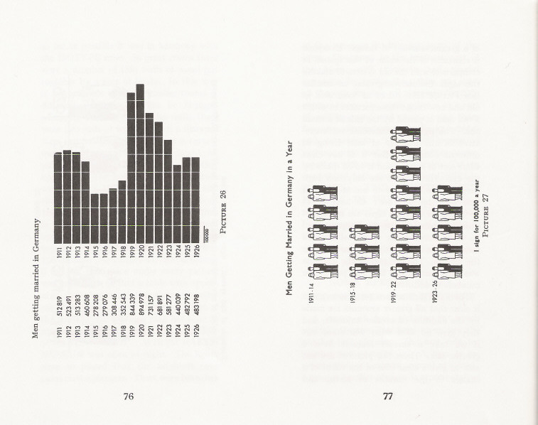 What lives on in this book? Working your way through the strange deformations of Basic English and the sometimes touching antiquity of the images, you find things that must be pertinent, still, for any designer. For example: the continuous line of a graph (‘curve’ in Basic English) tells an untruth. We have only isolated data: so show those, as discrete bars. Or, how to order a set of quantities? By size? But then you only see the same story: increase or decrease. Better to find another principle of order: perhaps time or geography. Design a system that will let the material speak for itself. Above all there is the founding idea of Isotype: in representing quantities, repeat a unit, don’t enlarge it. Don’t say more than you know.