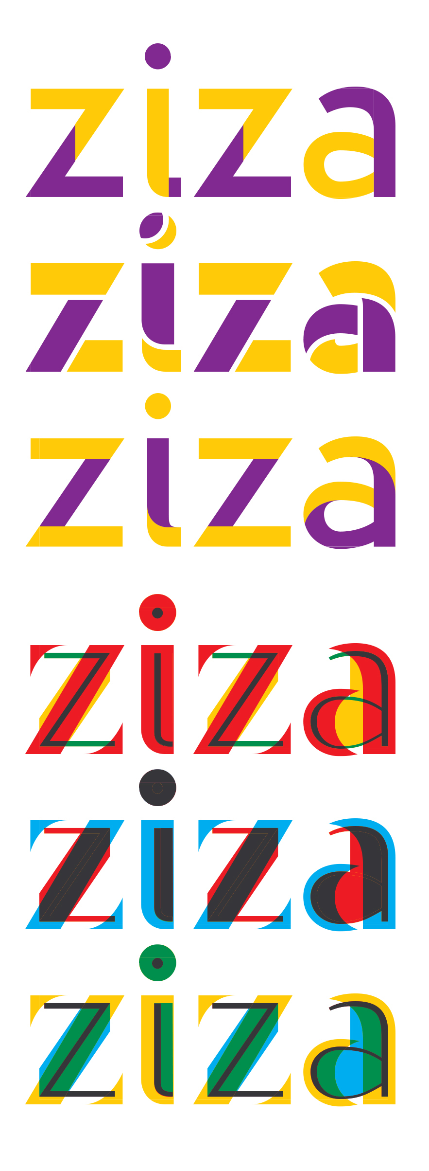 Three versions of ‘ziza’ set in two interlocking fonts in purple and yellow respectively. Ziza family, designed by Mark van Wageningen, Novo Typo, 2016.