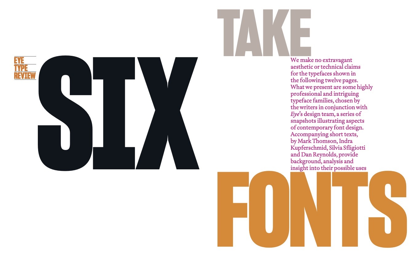 We make no extravagant aesthetic or technical claims for the typefaces shown in the following twelve pages. What we present are some highly professional and intriguing typeface families, chosen by the writers in conjunction with Eye’s design team, a series of snapshots illustrating aspects of contemporary font design. Accompanying short texts, by Mark Thomson, Indra Kupferschmid, Silvia Sfligiotti and Dan Reynolds, provide background, analysis and insight into their possible uses.