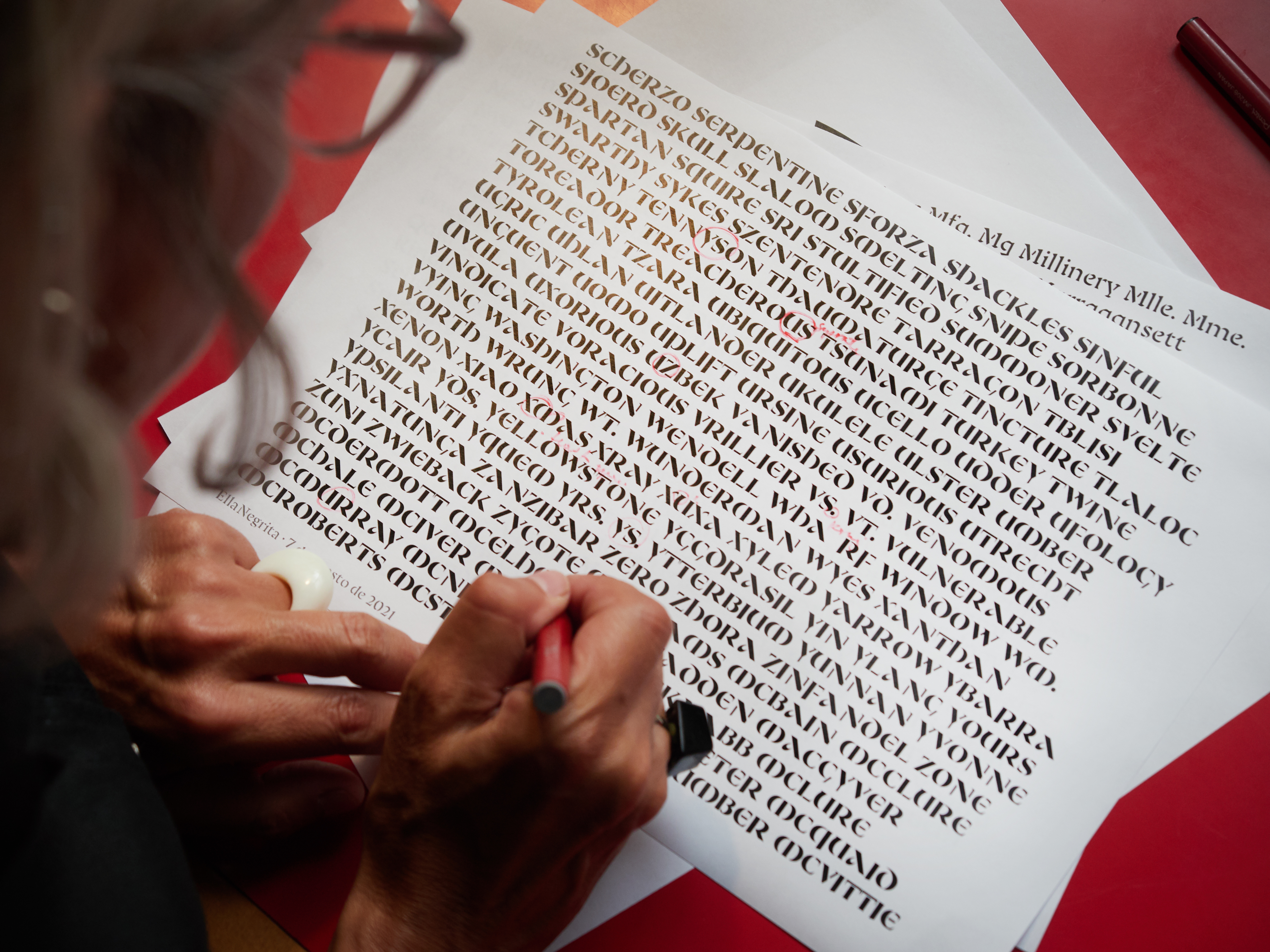But Meseguer’s Ella project was a personal initiative first developed during a residency (Mujeres Hispanas y Tipografía) at the Hoffmitz Milken Center for Typography in early 2021. She later developed its shapes with the input of two respected Barcelona calligraphers, Oriol Miró and Laia Soler. Apart from the historical and technical themes, Meseguer speculates about the link between unconventional, yet century-old transitions from straight lines to curves in her explorative Ella and the architectural style of Brutalism. Ella’s beguiling characters form yet another chapter in Meseguer’s fascinating career.