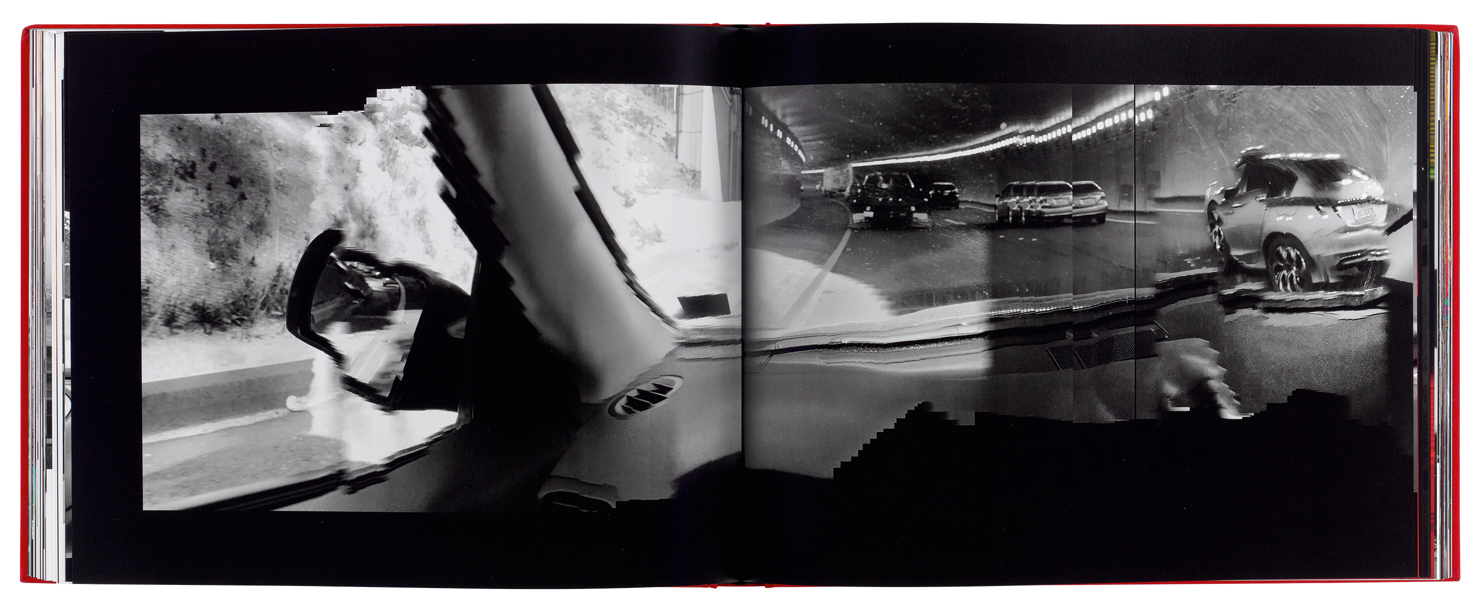 Sylvian was fascinated by the glitches and errors that occurred as the iPhone’s technology attempted to keep up with the speed of his car. Back in his lodgings each evening, he edited his iPhone images, removing most of the colour, but occasionally leaving a trace of red that echoed the car’s interior. Towards the end of his middle-American odyssey, the effects of the global pandemic began to make themselves known. Sylvian reflects upon the intimations of mortality brought by the sight of a, ‘multi vehicle pile-up … a car burst into flames … brutalized SUVs, trucks and fragments of vehicles being pulled from the road.’ He muses that the occupant of a comfortable, air-conditioned car interior is ‘frequently the length of one, possibly two cars from oblivion’.
