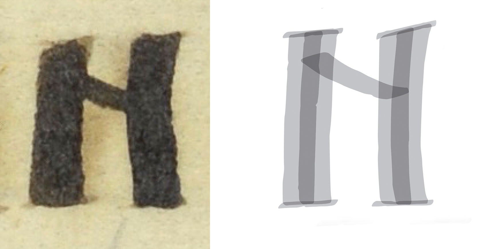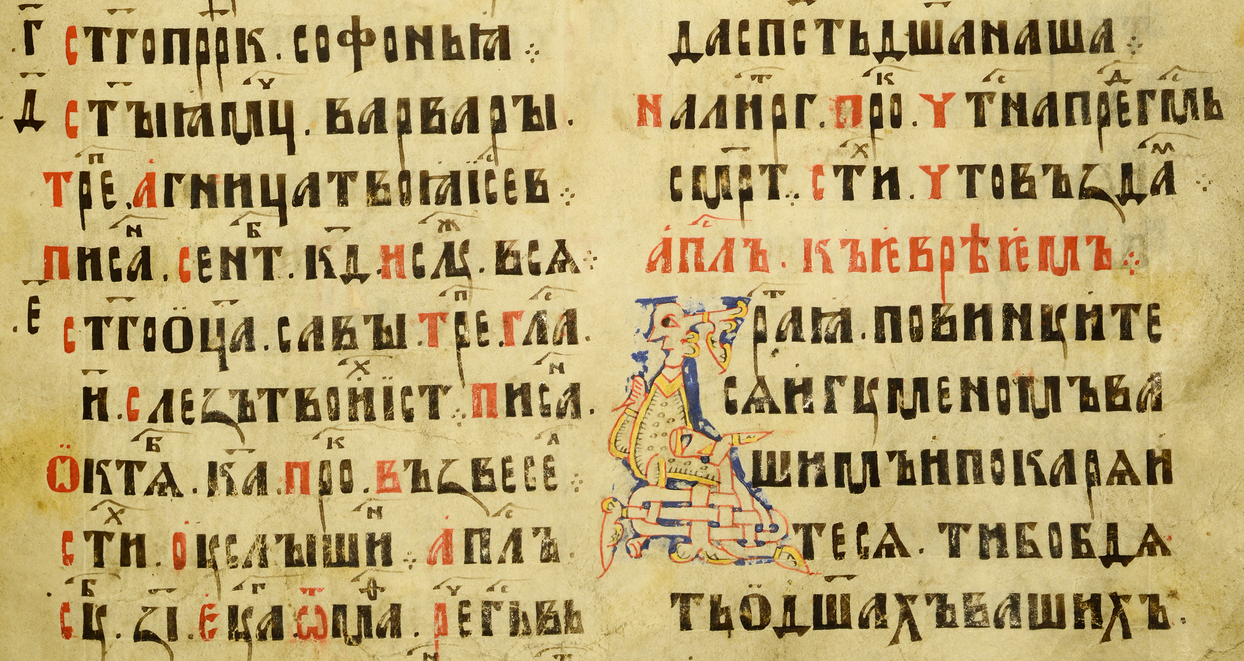 Hand-drawn Cyrillic ‘liturgical simple polustav’ letterform (ca. 1456), a stylistic choice that included overlapping calligraphic strokes forming a singular glyph, as shown by Maria Skopina and Oleg Macujev.