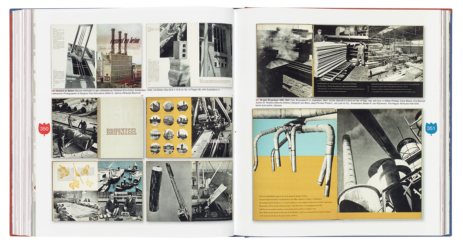 Spreads from 50 jaar Bruynzeel designed by Jan Bons, 1947, with two spreads from Schuitema’s 1940 Cement en Beton in the top left corner.