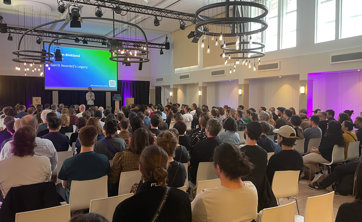 It was a Dutch train strike, rather than Covid-19, that threatened to disrupt Fontstand’s in-real-life event on 10 September 2022. An opportunity for Fontstand’s partners to meet and talk in public about their work, a young audience of type designers, type users and students gathered at the Sound and Vision museum in The Hague. Peter Bil’ak kept the tone warm and democratic. There was history: Erik van Blokland began the day talking about the legacy of Gerrit Noordzij, but if the event had a thread, it was developments in multiple writing systems and font technology. A highlight was Sarang Kulkarni and Noopur Datye from Mumbai’s Ek Type explaining the complications of designing type in a region with seventeen different script systems.