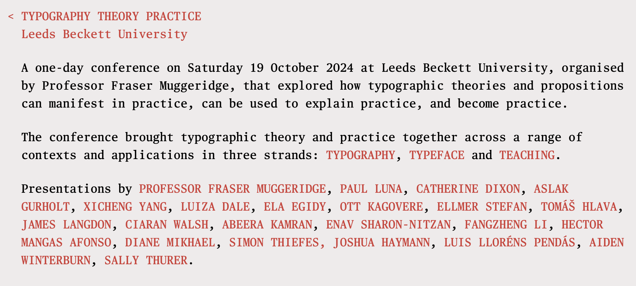 This was a great coming-together of designers, tutors and students from all over Europe, an audience keen to take a brief but tightly focused view of all aspects of typography, research and practice. For me, the most memorable talk was Abeera Kamran’s on Urdu newspaper design. The talks are now online (typographytheorypractice.xyz), but for the really enriching experience of chats between talks, in corridors, you should be there. The 2025 conference is on Saturday 25 October. Book now.