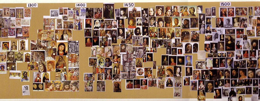 The book is organised into three main sections: visual evidence; textual evidence (contemporary accounts of painting and optics); and correspondence. The 500-year wall is shown in a four-page gatefold at the start of the book. Familiar images from the history of art are repeated and juxtaposed and manipulated to emphasise the questions and arguments. Hockney points out what technology has made possible: ‘Computers have allowed cheaper and higher-quality colour printing, leading to a great improvement in the last fifteen years in the standard of art books. And now with colour photocopiers and desktop printers anyone can … place works that were previously separated by hundreds or thousands of miles side by side … it was only by putting pictures together in this way that I began to notice things.’