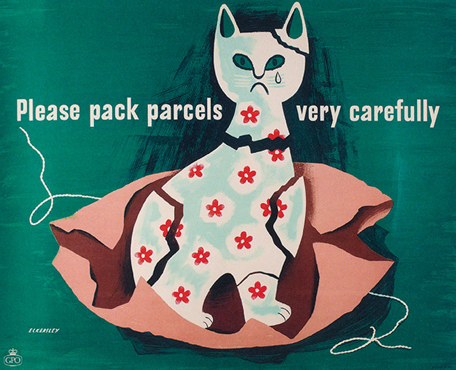 In the 1950s, economic austerity compressed industrial activity throughout the UK at the same time as practitioners were re-establishing their networks and presenting a coherent manifesto for graphic design and its role in redevelopment. Thoroughly engaged in these activities, Eckersley continued to design posters, combining his Modernist sensibilities with dark British wit, as in his now-iconic ‘Please Pack Parcels Very Carefully’ series for the General Post Office (GPO), see ‘China Cat’, 1958, left, reproduced alongside lesser-known work for Pakistan International Airways and the Foreign Office.