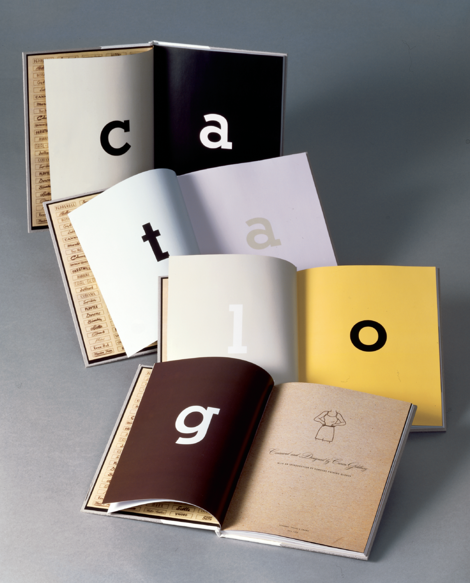 Graphic designer Carin Goldberg’s first book is a catalogue. Though at first glance it is reminiscent of the abstract picture books assembled in Tibor Kalman’s Chairman or Alan Fletcher’s recent The Art of Looking Sideways, Catalog, at just under 70 pages, has more in common with an artist’s book by Ed Ruscha than anything in the traditional design book market. While Kalman and Fletcher are telling concrete stories about people and ideas, Goldberg is not telling a linear narrative per se; instead she’s created a dark, musty gallery in book form.
